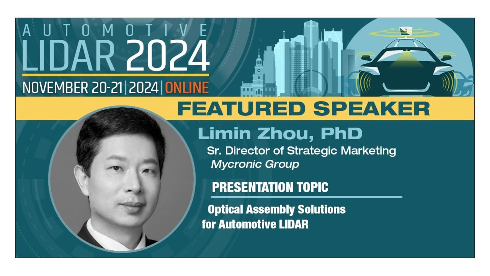 Dr. Limin Zhou from MRSI Mycronic will present "Optical Assembly Solutions for Automotive LIDAR" on Thursday, November 21st, 2024. The presentation will explore automotive LIDAR trends in package development and optical assembly requirements. Dr. Zhou will demonstrate comprehensive optical assembly solutions for automotive LIDAR, encompassing high-precision die bonding and active alignment processes.