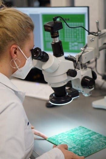 One of the key motivations for the new investment was the need to handle far smaller components, down to dimensions of 150μ x 300μ, as well as larger board formats. “By replacing our four pick-and-place machines with three MY300s, we now have a much wider range of both board sizes and component types,” explains Andreas. “They can be as small as 01005 or 03015 chips, or as large as 140 x 73 x 22 mm. Now we’re able to print, assemble and solder PCBs as large as 640 x 510 mm.”