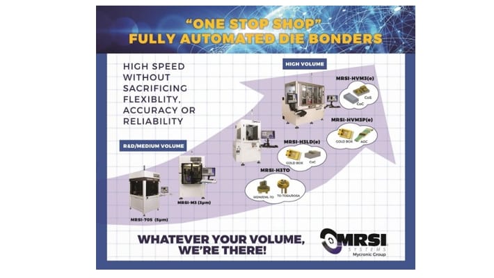 “Our ‘One Stop Shop’ solutions will help our customers to enable just-in-time supply and fast-pace innovations of critical photonic component for high growth market segments such as hyper-scale data centers, photonic sensors, and 5G wireless,” stated Dr. Yi Qian, Vice President Product Management of MRSI Systems. “MRSI Systems has been serving optoelectronic and microelectronic customers for the past thirty-four years and understands their requirement to scale efficiently in today’s fast paced marketplace. MRSI is pleased to meet these needs with the expansion of our high speed die bonder families for high volume manufacturing of photonics packaging,” said Mr. Michael Chalsen, President of MRSI Systems.